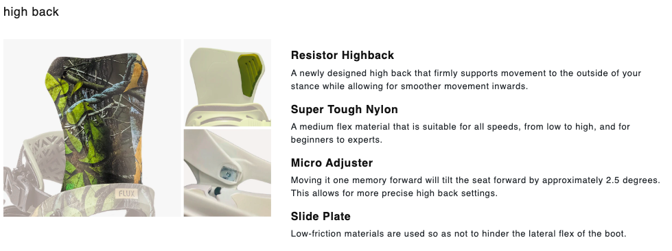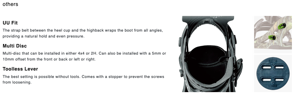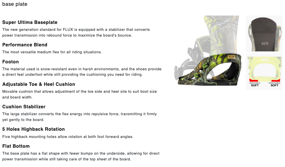 An all-purpose model suitable for all conditions. The toe side, which is less likely to transfer force, features a wide base plate that prioritizes efficient transfer of force to the board, while the heel side, which requires flexible movement to make it easier to play, has a highly cushioned and resilient stabilizer that expands the range of motion.