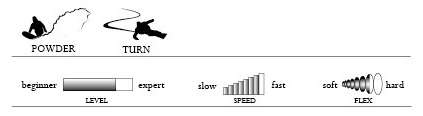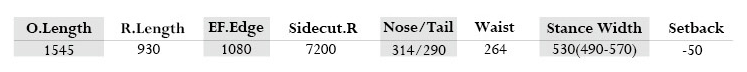 The Q545 is shaped for superior surface control and fast turning speed on 3D terrain, and you’ll also experience an exquisite flow in powder and rail-like turning speed on packed snow. The board has a good balance of maneuverability and stability, making it easy to control the board as you wish. We hope you enjoy the Q545, which has a slightly different feel from the rest of the Q series.