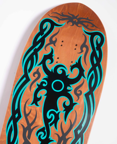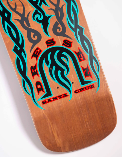 The Santa Cruz Skateboards Dressen Tribal Reissue 9.9″ x 31.4″ deck features legendary Santa Cruz Eric Dressen Tribal artwork on a brown stain deck bottom with a black stain deck top on his OG reissue shape with an adjustable wheelbase of 14.25″ – 14.75″.